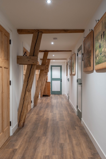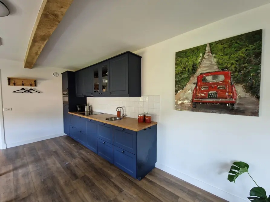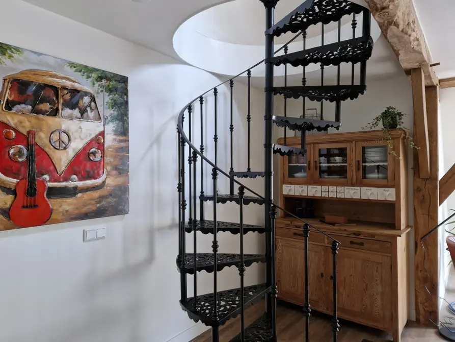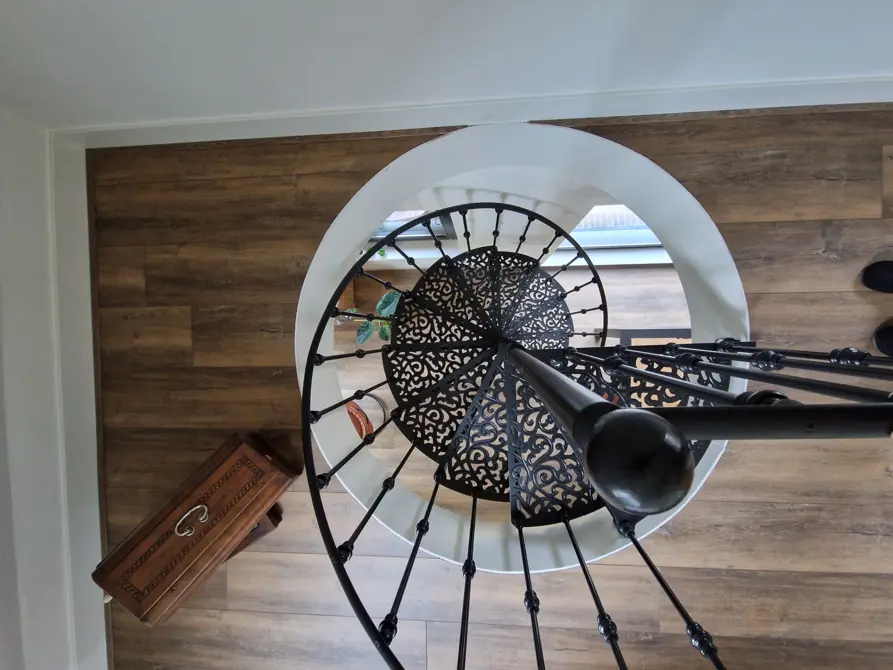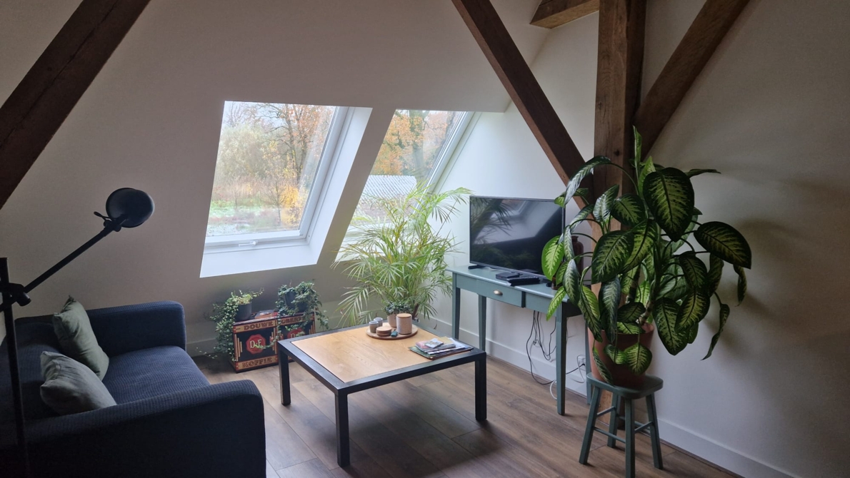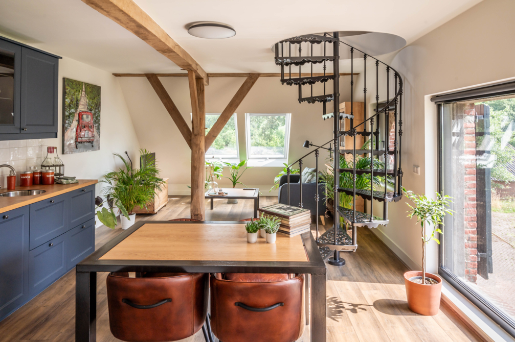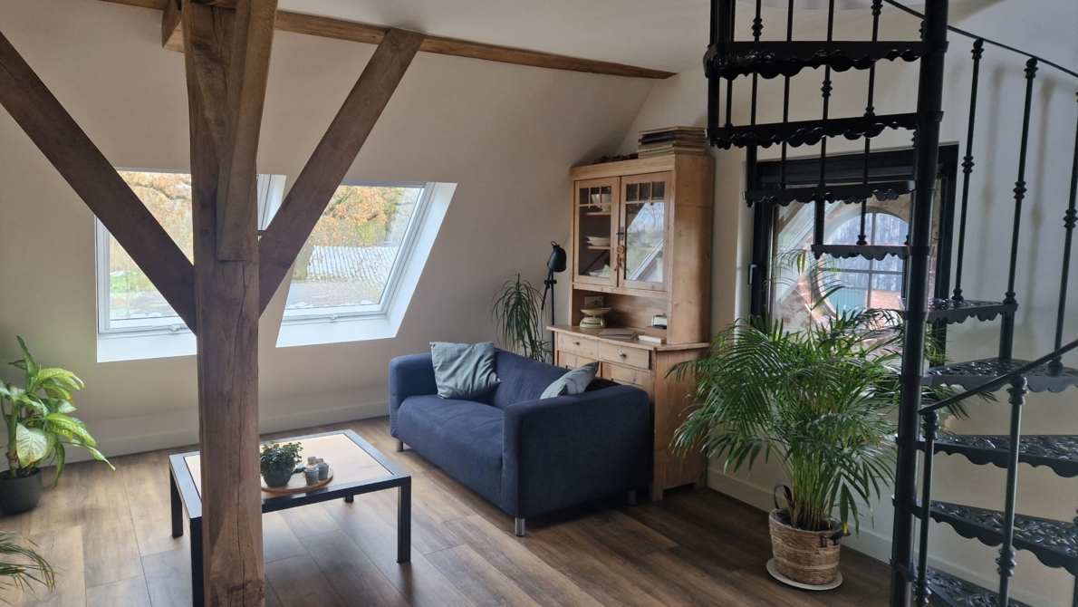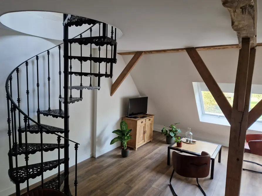 De appartementen bevinden zich op de voormalige hooizolder en zijn te bereiken via een gezamelijke trapopgang. Het appartement zelf heeft vervolgens 2 etages, via de wenteltrap naar boven bevindt zich de slaap- en badkamer, bij binnenkomst de keuken met eettafel en zitje.